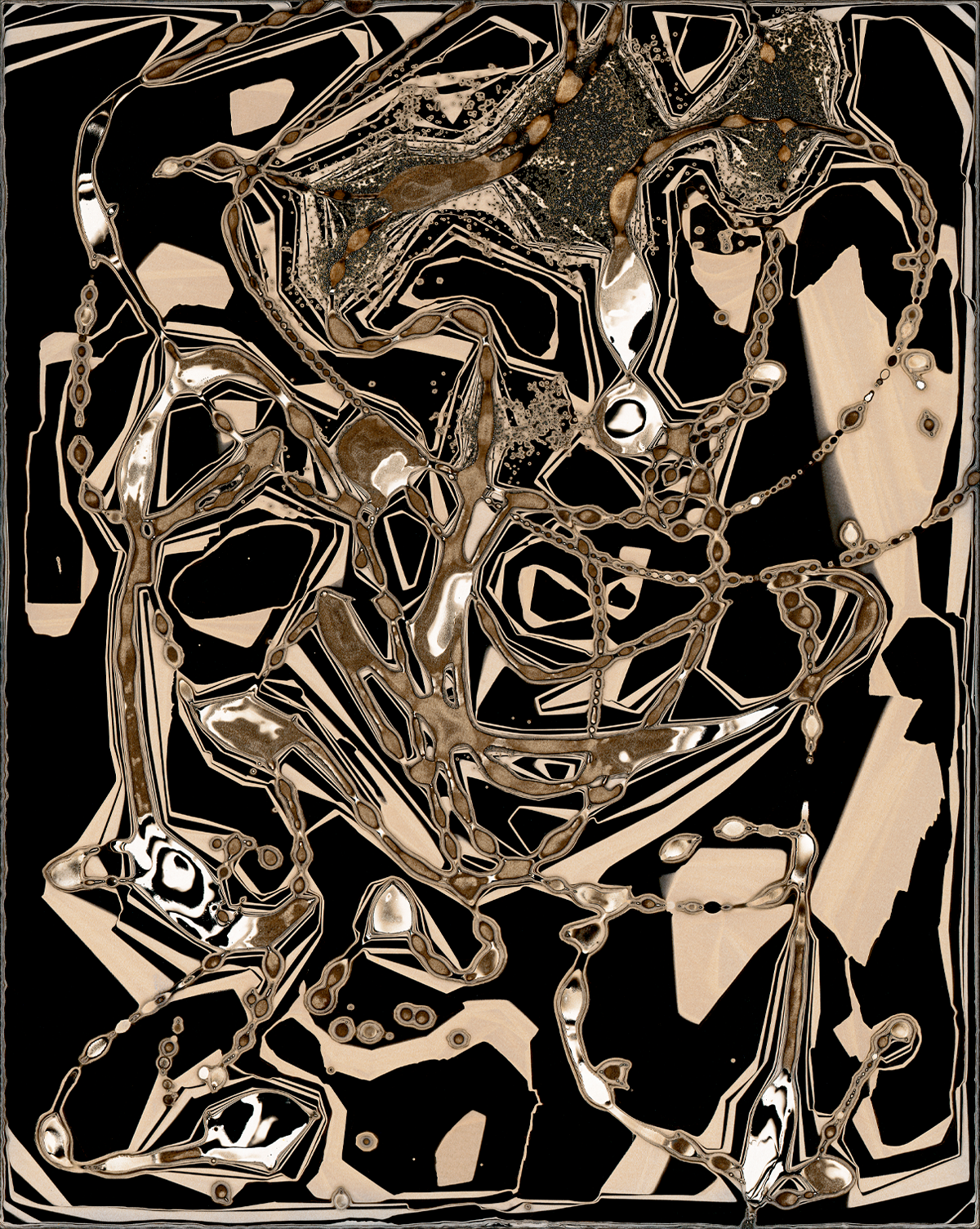 Creative Concussion is made using varnish, glue, and honey applied to black-and-white photographic paper as resists. These materials act as temporary barriers, preventing the photographic chemicals from fully reaching the paper. Once the resists have dried, the paper is exposed to light and then passed through trays of developer, stop bath, and fixer.